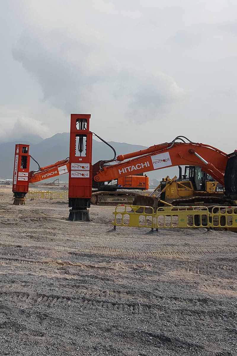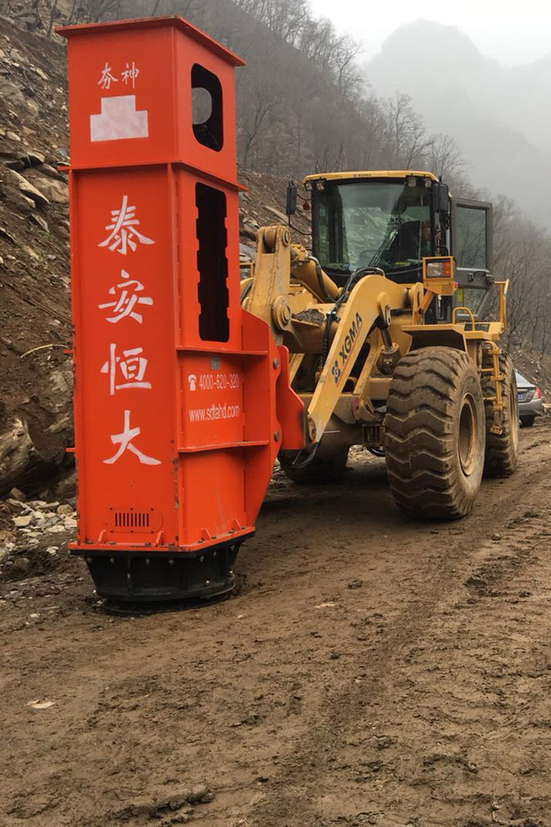 HH系列高速液壓樁錘可懸掛作業,起重機直接吊起樁錘打樁。特別適合于打斜樁,打密集的板樁,在不便接近的位置打樁。